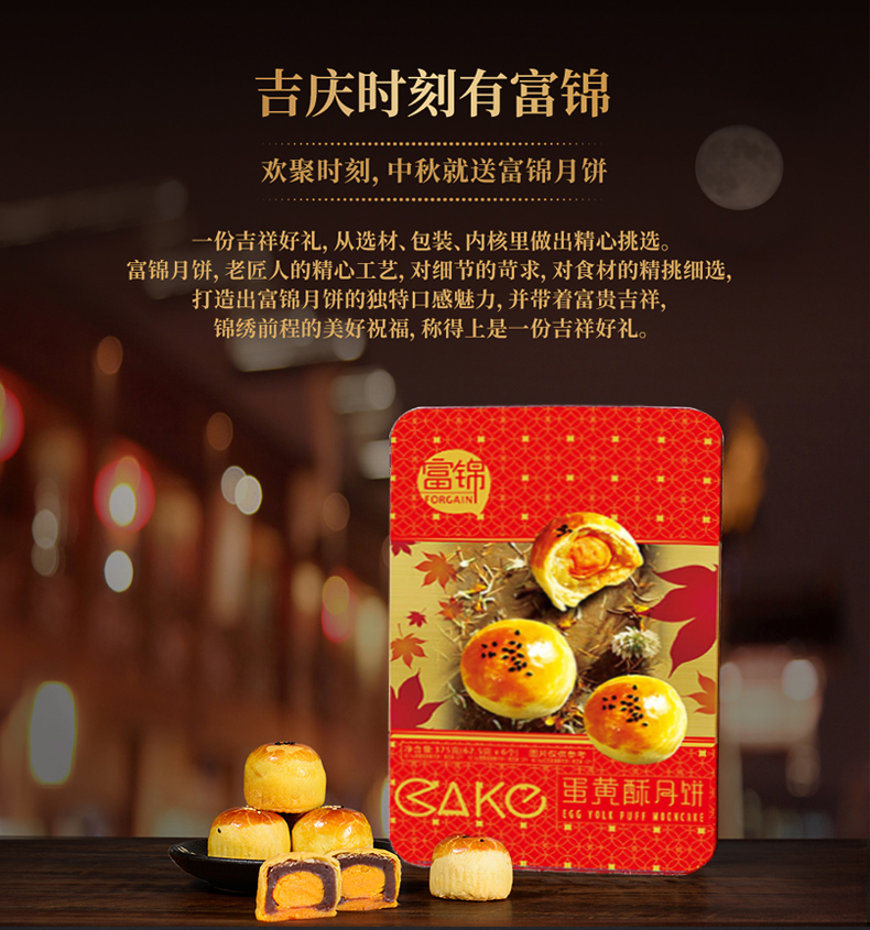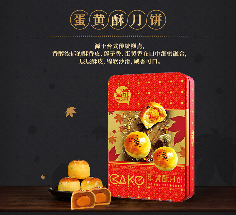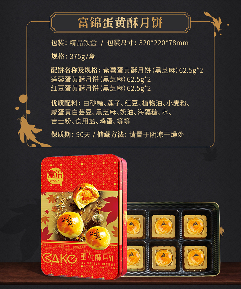 配餅名稱及規格: 蓮蓉蛋黃酥月餅(黑芝麻)63g*2 紫薯蛋黃酥月餅(黑芝麻)63g*2 紅豆蛋黃酥月餅(黑芝麻)63g*2 條形碼:6921644317603 盒子尺寸:32*20*5.8cm 外箱尺寸:42*33.5*28.5cm