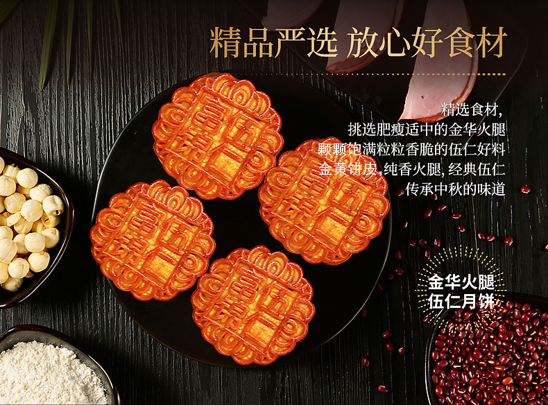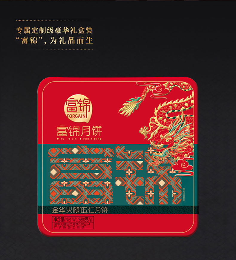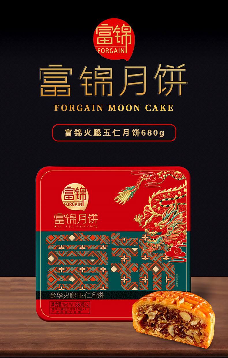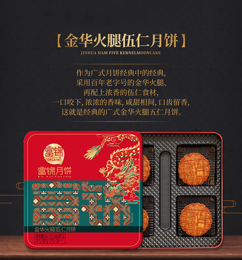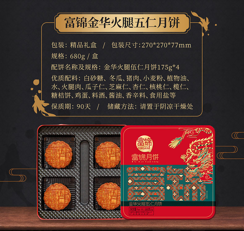 配餅名稱及規格: 金華火腿伍仁月餅175g*4 條形碼:6921644301701 盒子尺寸:27*27*7.6cm 外箱尺寸:56.5*30.5*40.5cm 零售價:238.00 特售價:188.00元