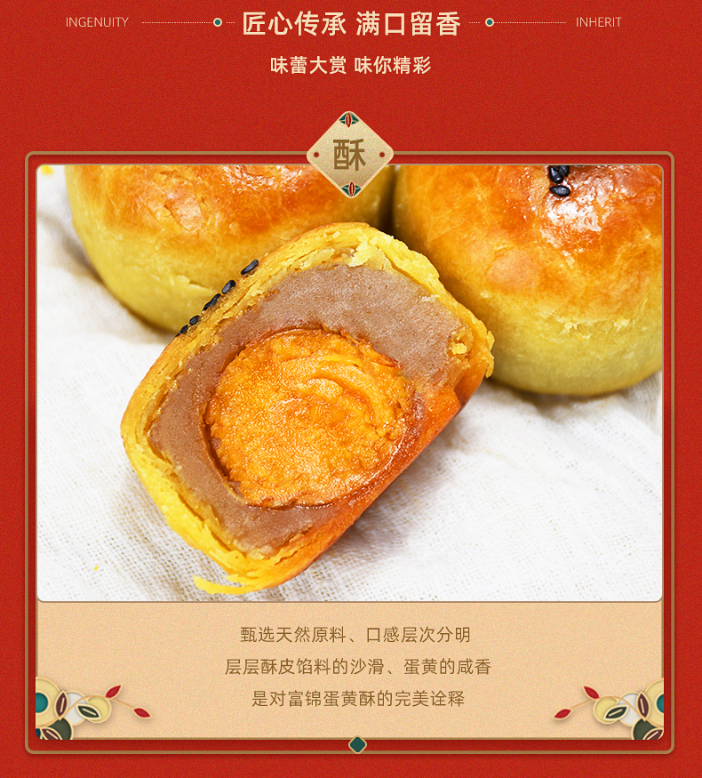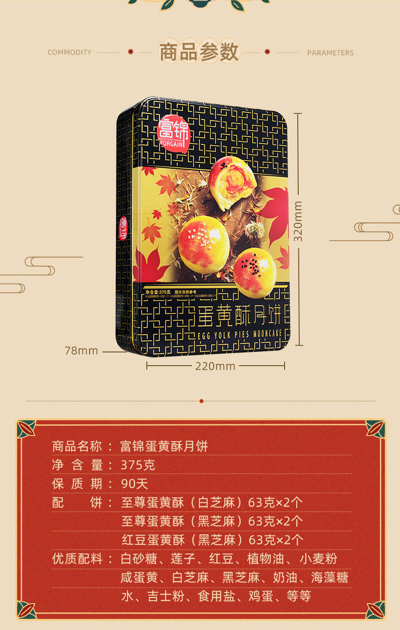 配餅名稱及規格: 蓮蓉蛋黃酥月餅(黑芝麻)63g*2 紫薯蛋黃酥月餅(黑芝麻)63g*2 紅豆蛋黃酥月餅(黑芝麻)63g*2 條形碼:6921644317603 盒子尺寸:32*20*5.8cm 外箱尺寸:42*33.5*28.5cm 零售價:188.00 特售價:148.00元